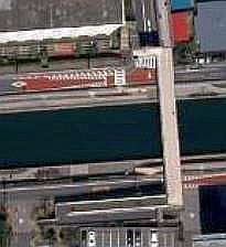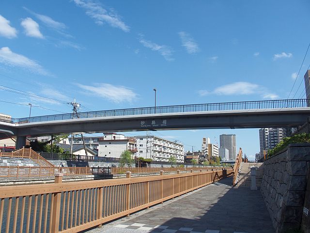 南岸の散歩道から橋の西側面を見上げる。南の北砂地区と北の大島地区を結ぶ歩行者・自転車専用橋。